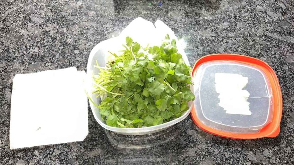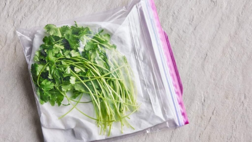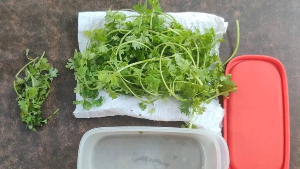 Lay the coriander on a dry paper towel, roll it up gently, and place it inside an unsealed plastic bag or airtight container. The paper towel acts as a moisture absorber while the container helps retain the right level of humidity. Store it in the vegetable crisper drawer of your refrigerator for best results.